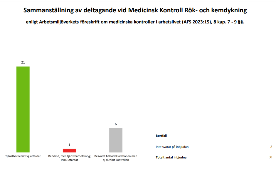Bearbeta statistik och ta fram en grupprapport som stöd i det systematiska arbetsmiljöarbetet. Varje rapport inkluderar sammanställning av deltagande i respektive medicinsk kontroll enligt nedan.